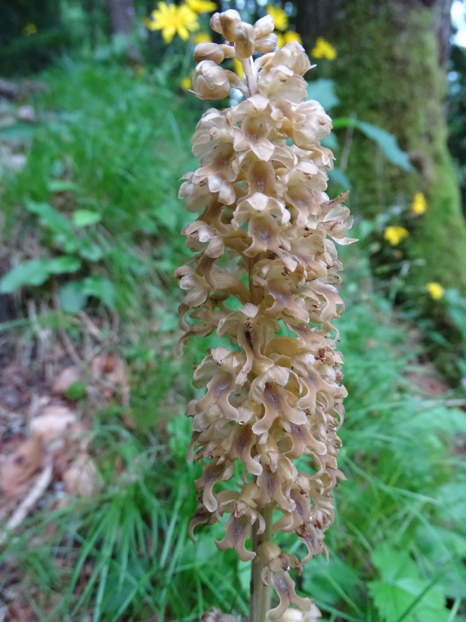 Gegenüber des Gasthof Fetz am Bödele geht es auf den schönen Wiesenweg in Richtung Brüggele/Alberschwende. Nach wenigen Metern durchqueren wir schon die erste Besonderheit der Tour. Die kleine Hochmoorfläche beheimatet eine Vielzahl an seltenen und geschützten Arten. Verschiedene Orchideen, Wollgras und vieles mehr lässt sich hier von Holzplanken, die zum Schutz des Moores als Weg dienen bestaunen. Es geht gemütlich entlang von Wiesen und durch einen kleinen Waldgürtel weiter bis wir den ersten kurzen Anstieg erreichen. Auf einer Straße geht es hinauf in Richtung Geiskopf. Hier finden sich am Wegesrand Unmengen von wildem Thymian. Wir folgend der Beschilderung Brüggele/Alberschwende, verlassen die Straße nach einigen Metern und wandern mit einem kurzen An- und Abstieg durch ein schönes Waldstück. Aufmerksame Beobachter können hier die besondere Vogel-Nestwurz entdecken. Sie ist eine parasitische Orchidee, die ohne Photosynthese überlebt. Sie wächst immer in der Nähe von Bäumen (meist Buchen oder Fichten) und zapft deren Wurzeln über ein Pilzsystem an, umso an die Nährstoffe zu kommen.