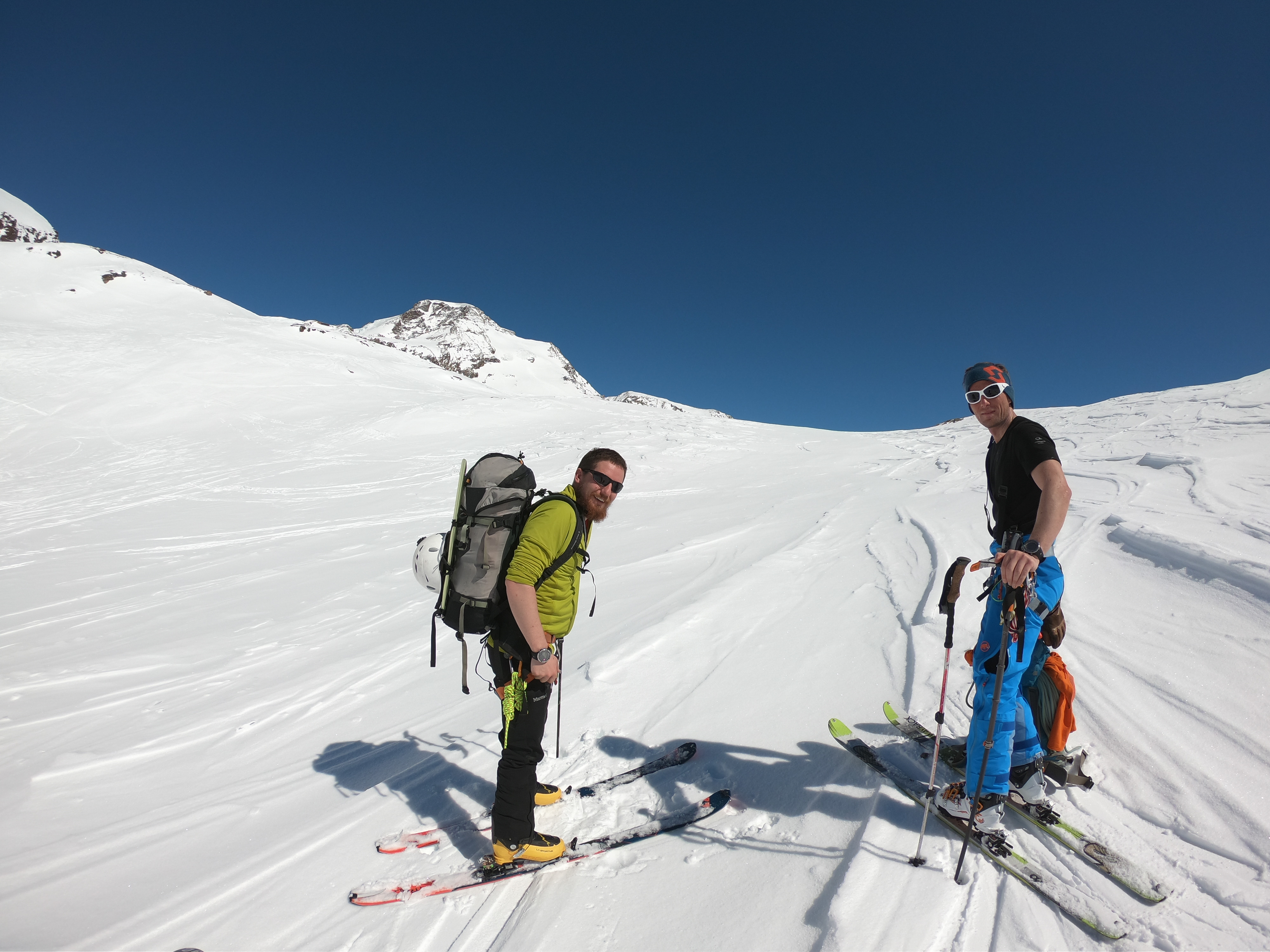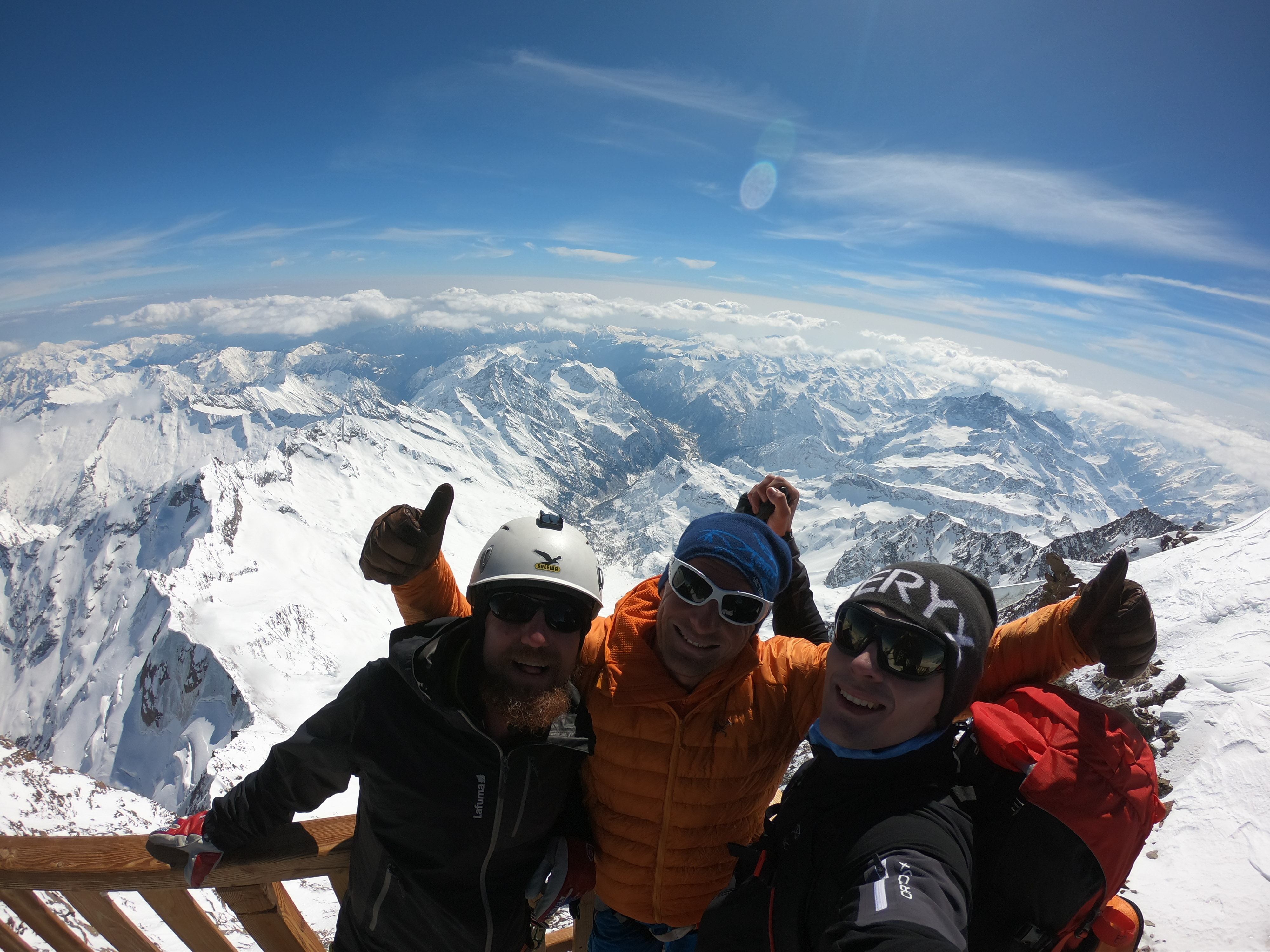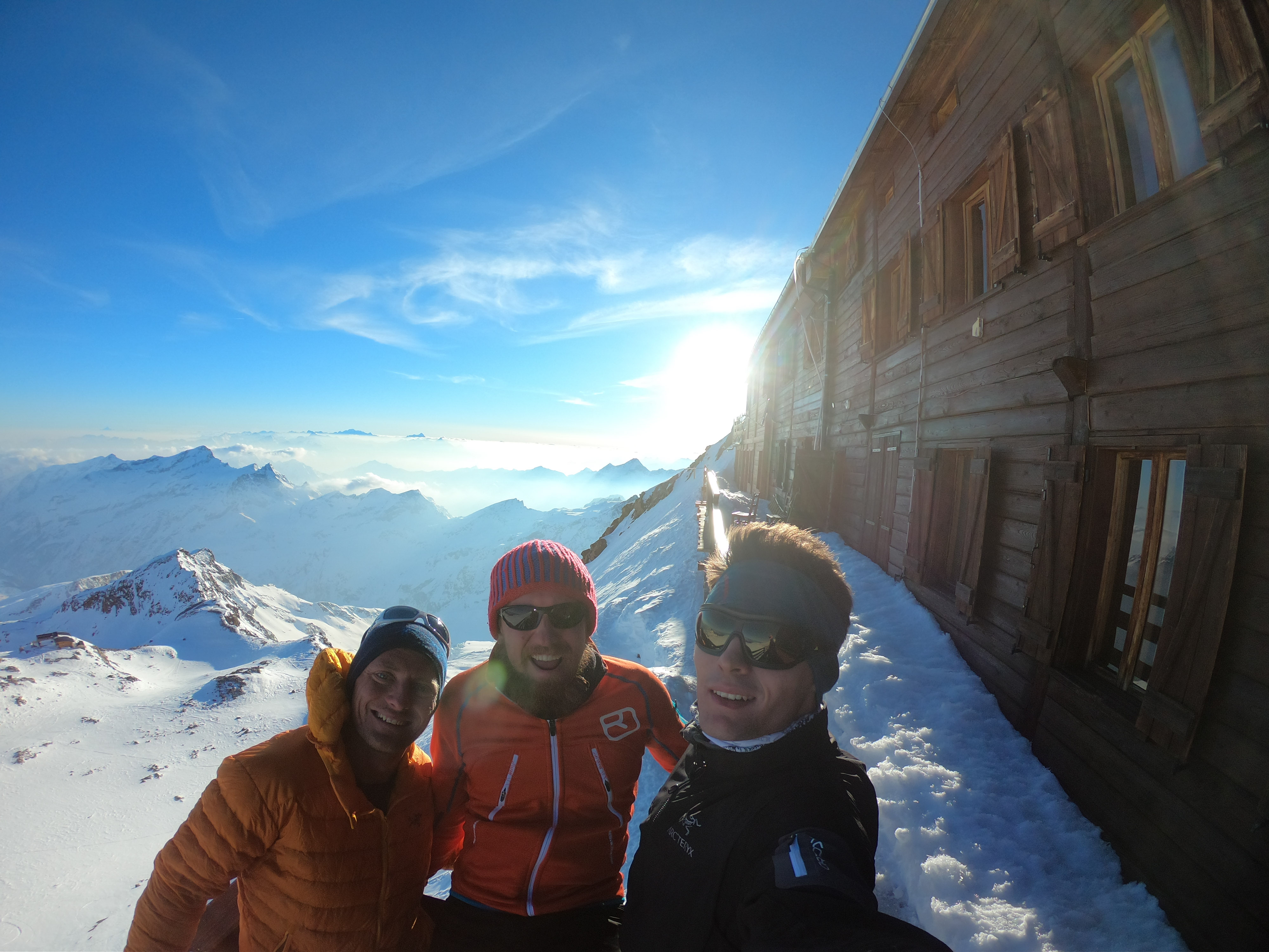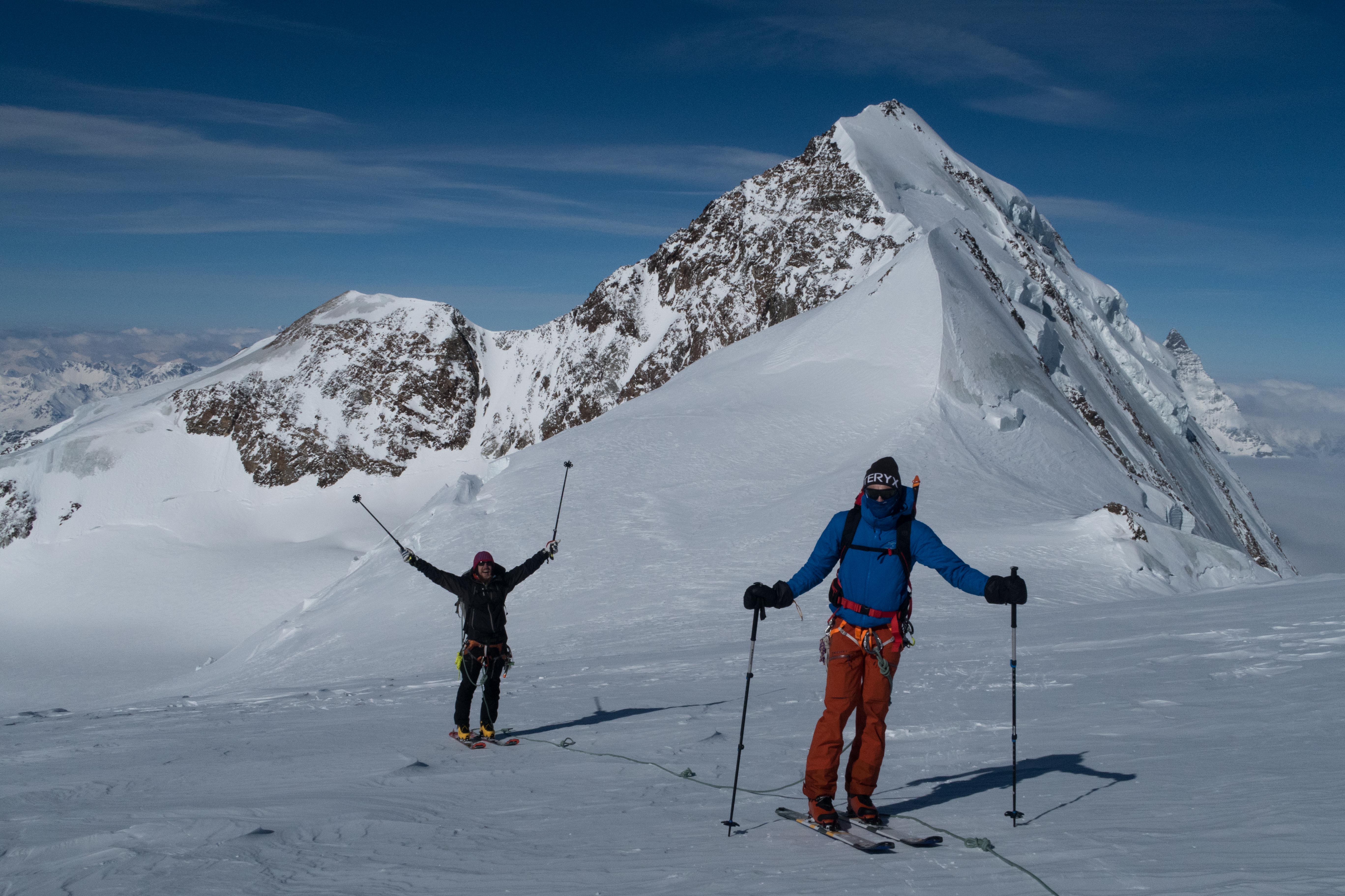 mit 2 Freunden für 3 Tage auf Skihochtouren im Monte Rosa Gebiet mit den Gipfeln: Vincentpyramide (4.215m), Balmenhorn (4.167m), Ludwigshöhe (4.341m) und zur höchstgelegenen Hütte der Alpen zur Margheritahütte auf dem Gipfel der Signalkuppe auf 4.554m